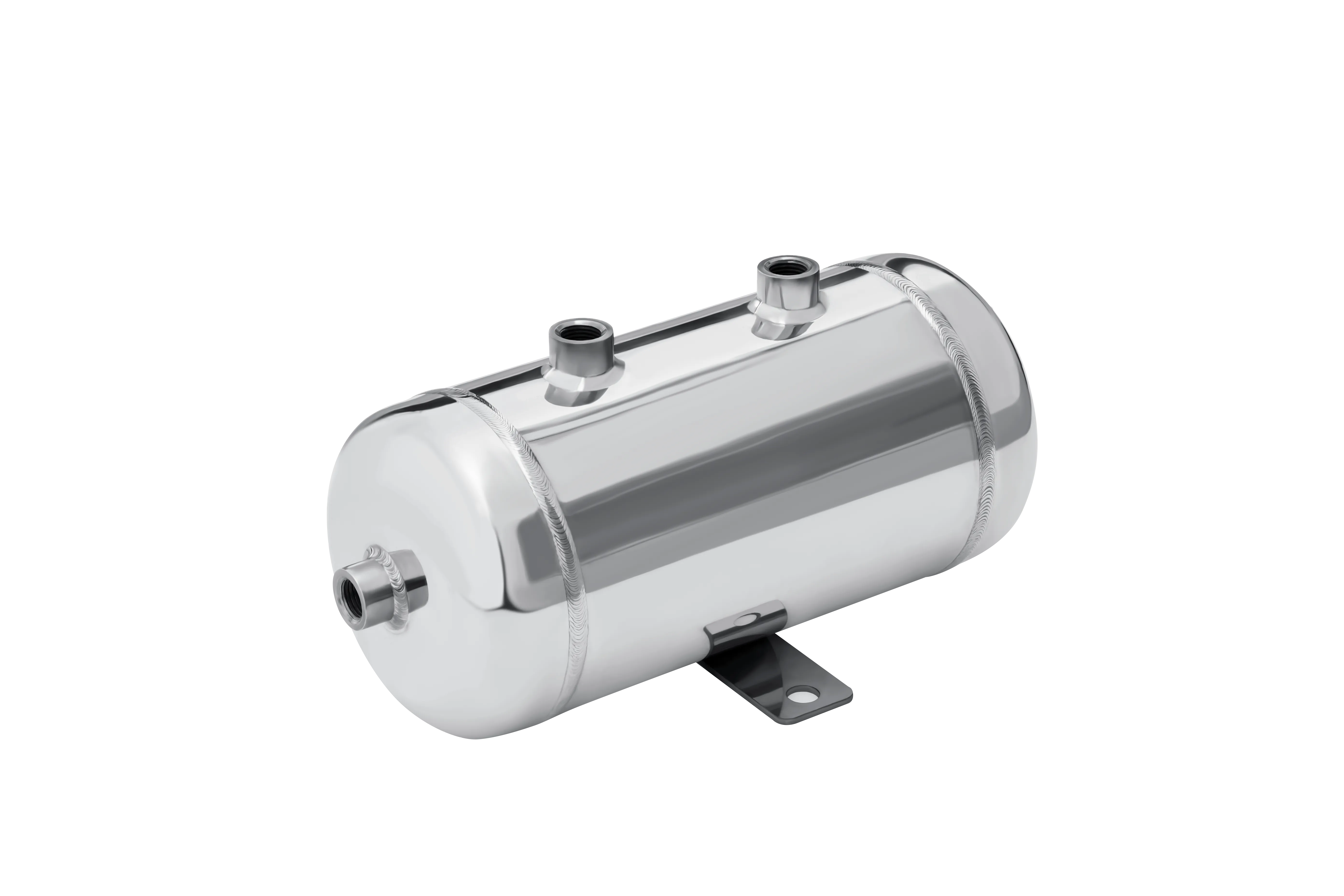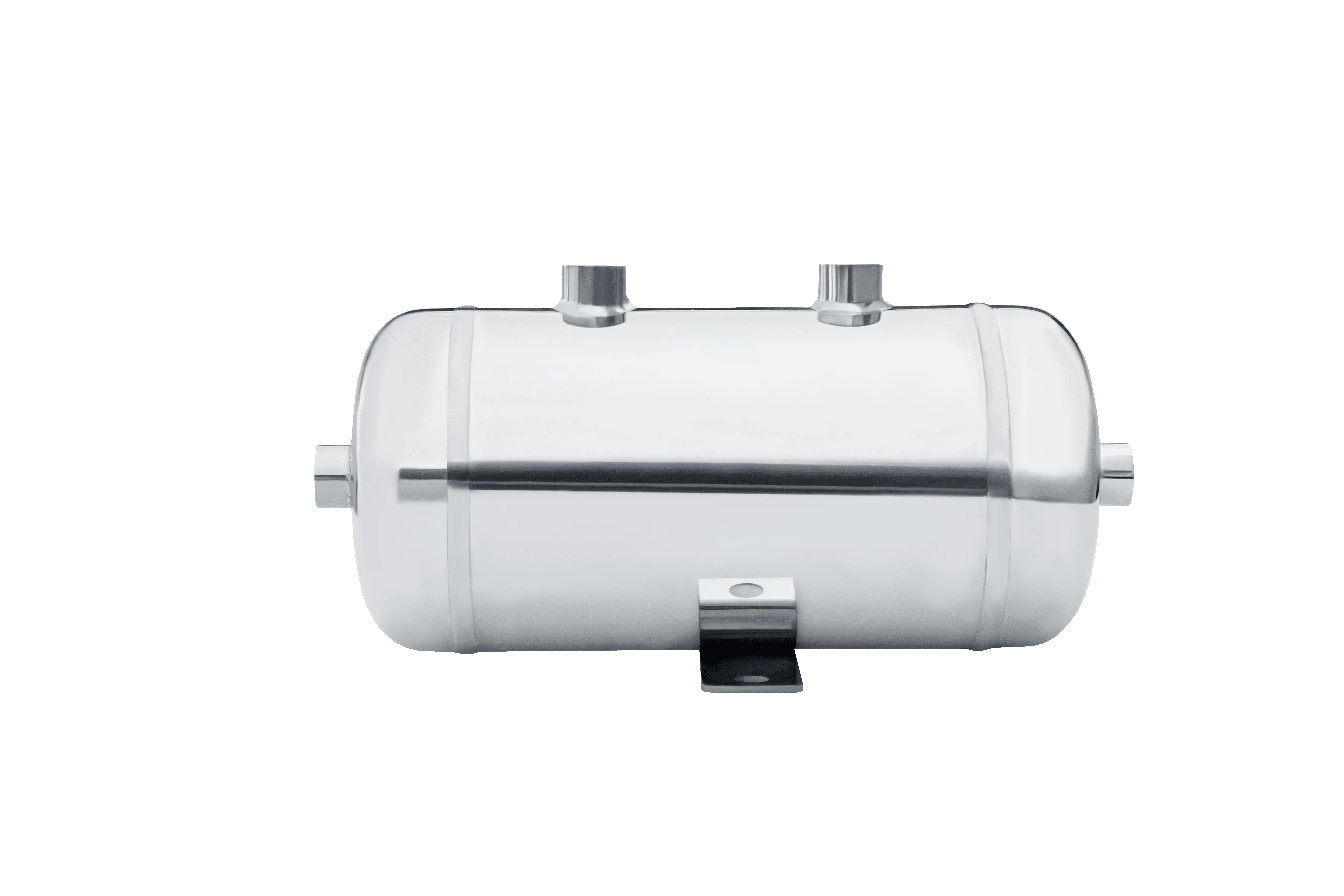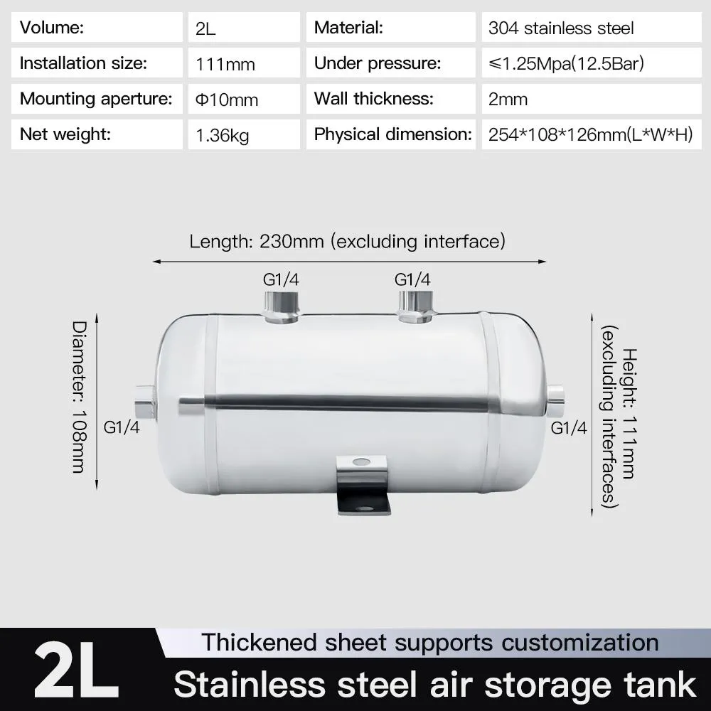 2L stainless steel air tank, 12 bar pressure vessel, equipped with 4 ports for flexible connection. Polished, durable, corrosion-resistant, ideal for air storage and pressure stabilization in pneumatic systems.