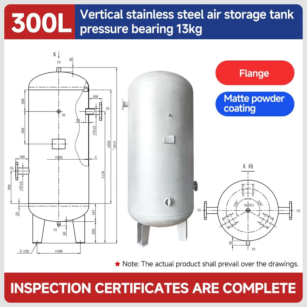 This 300L vertical air receiver tank, crafted from corrosion-resistant stainless steel, is engineered for high-pressure screw compressor systems. It offers customizable pressure ratings from 8 to 16bar and features versatile flange and screw port connections for seamless industrial integration