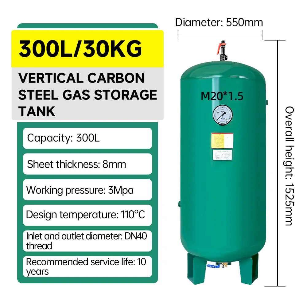 300L vertical carbon steel air compressor tank, working pressure ranging from 8 bar to 40 bar. Robust construction, customizable to meet high-pressure requirements for industrial pneumatic systems.