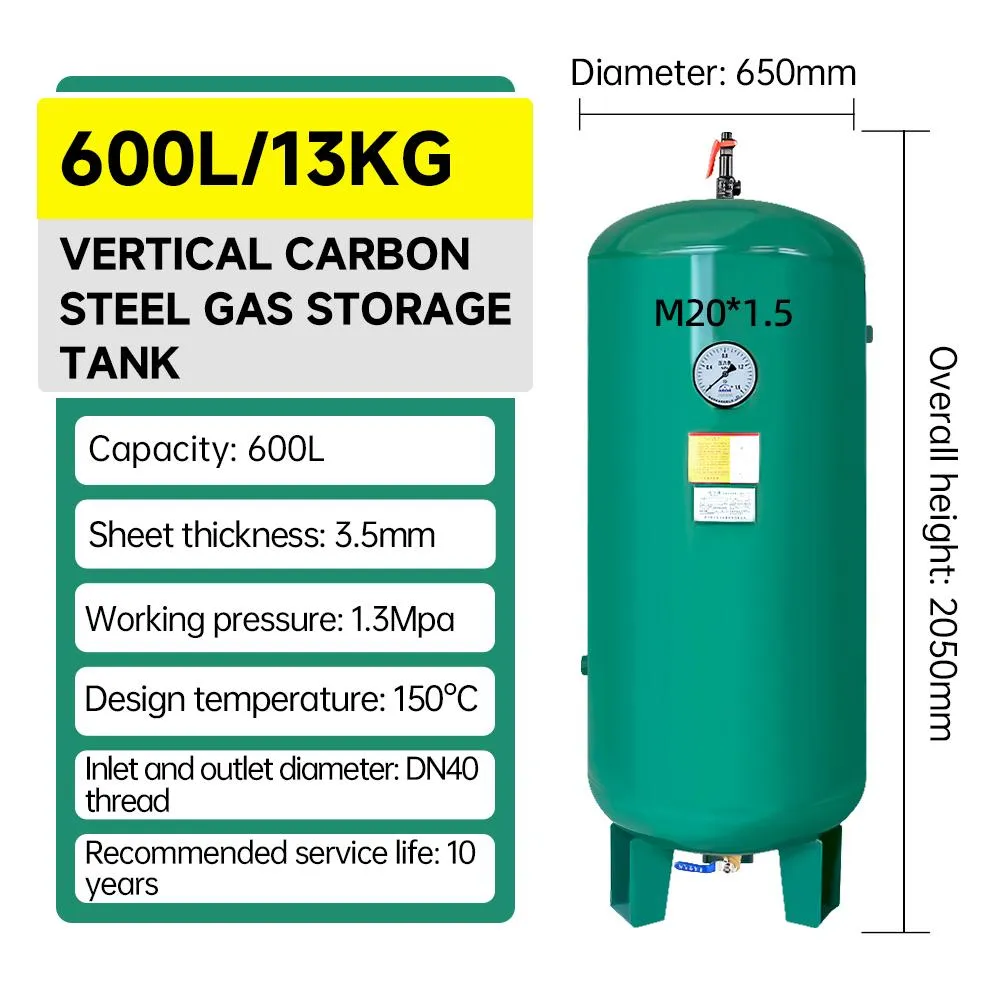 600L vertical carbon steel air tank, working pressure from 8 bar to 40 bar. Stable structure, high strength, suitable for industrial air compressors and pneumatic systems. Adequate stock for fast delivery.