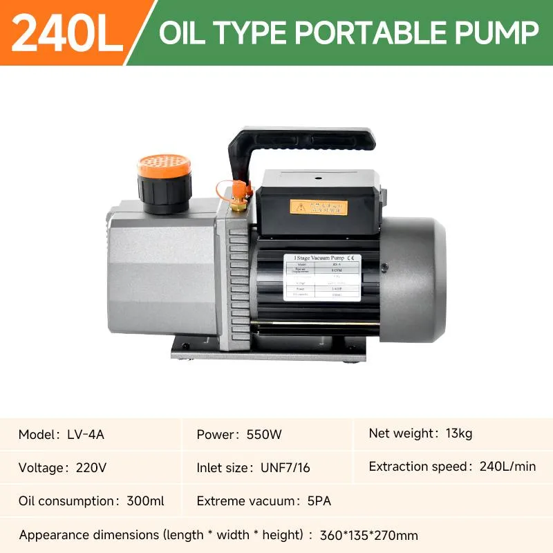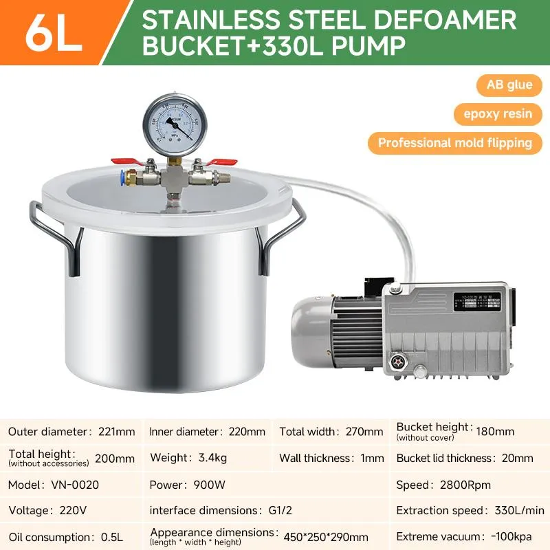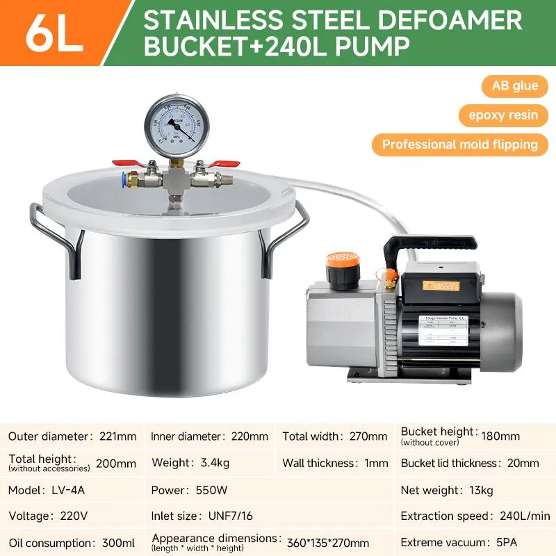 The 6L defoamer bucket is made of stainless steel with a 1mm wall thickness and 20mm thickened transparent cover, weighing 3.4kg, and comes with side handles, a pressure gauge, and dual red-handle valves for easy operation and monitoring. It has an outer diameter of 221mm, total width of 270mm, and total height of 200mm, perfect for degassing resins, silicone, and other materials in lab or industrial settings.