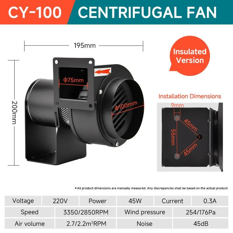 This compact centrifugal fan delivers up to 254Pa pressure and 132m³/h airflow. Available in a standard version and an heat insulated version with dual-speed performance (2850/3350 RPM), it's designed for efficient ventilation in applications requiring reliable air movement with low noise (45dB).