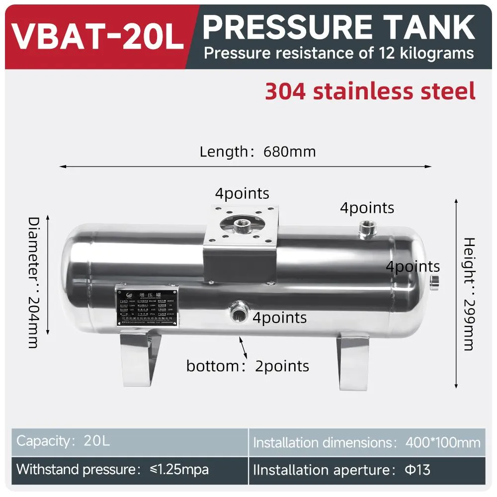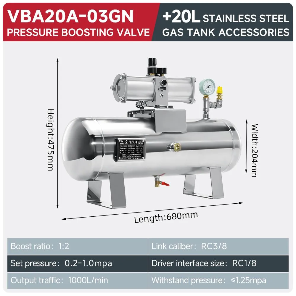 The VBA20A-03GN pressure boosting valve paired with a 20L stainless steel gas tank provides 2x pressure amplification, handling 1000L/min flow with RC3/8 connection caliber.