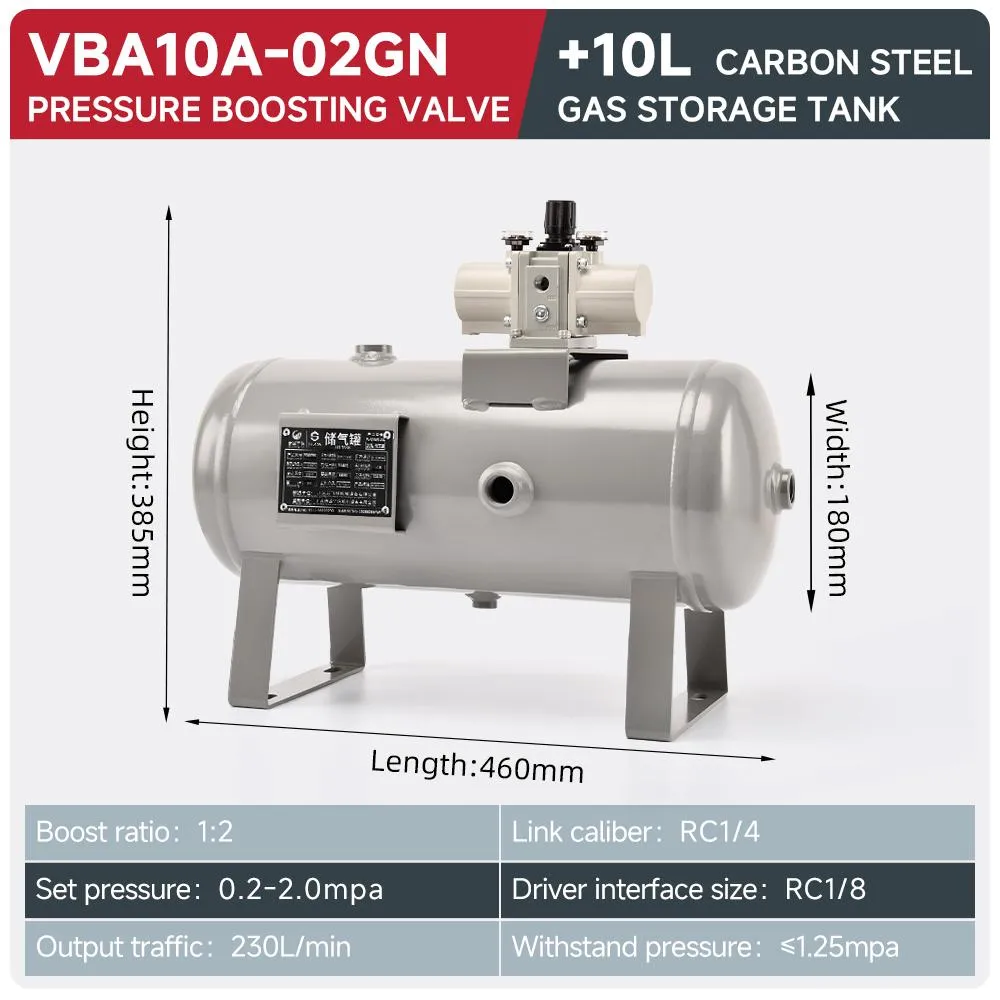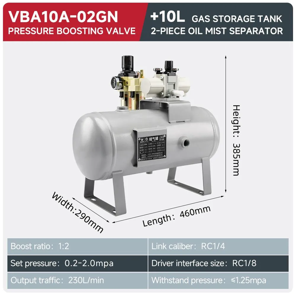 1:2 boost ratio, 0.2–2.0 MPa set pressure range, and integrated 10L air receiver, this compact system delivers stable, amplified compressed air for industrial pneumatic applications.