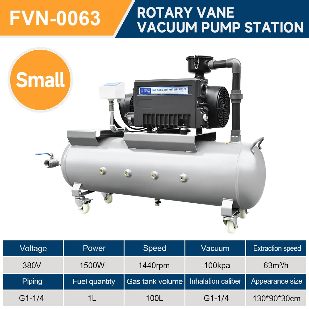 FVN-0063 Rotary Vane Vacuum Pump Station delivers 63 m³/h extraction speed with 380V, 1.5 kW power, -100 kPa vacuum, 100L gas tank, and G1-1/4 ports, featuring variations in oil quantity (1.5L vs. 1L) and dimensions for flexible industrial vacuum holding applications.