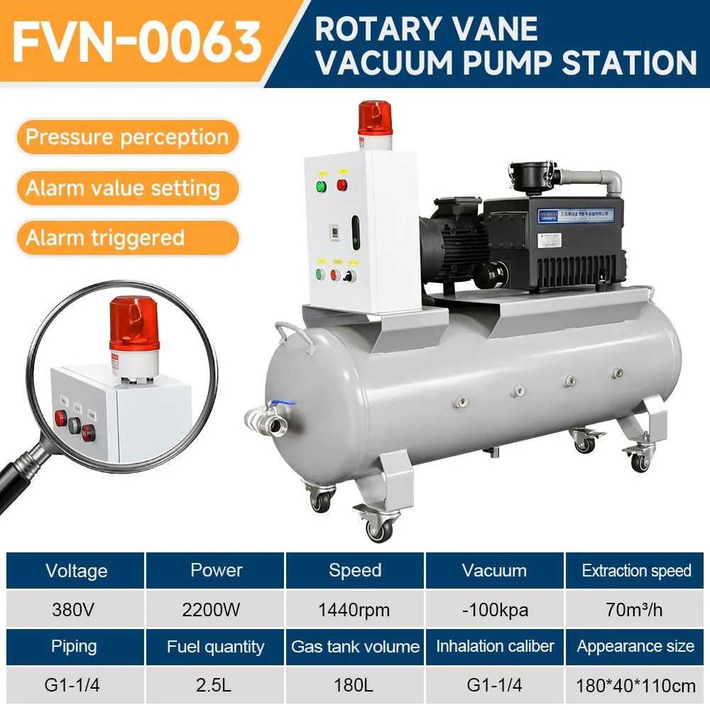 This 2.2KW (380V) industrial series delivers -100kPa vacuum with 70m³/h extraction, featuring a large 180L gas tank, mobile base, and intelligent monitoring (pressure sensing & alarm). The rotary vane vacuum pump station offers enhanced storage, providing robust, reliable vacuum for demanding holding, lifting, and production processes.