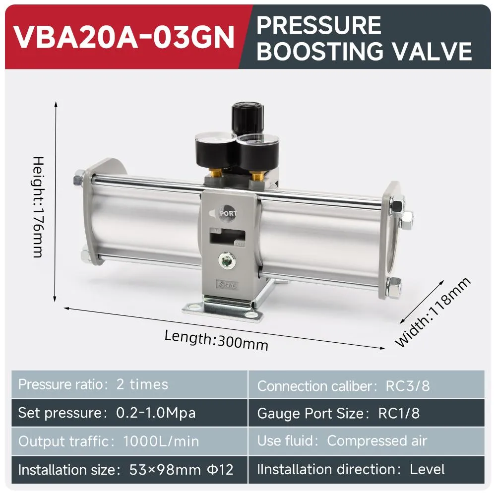 This 2-times pressure boosting valve operates on compressed air, with 0.2–2.0MPa set pressure, 230L/min flow, and RC1/4 connection, ideal for industrial pneumatic systems requiring pressure amplification.