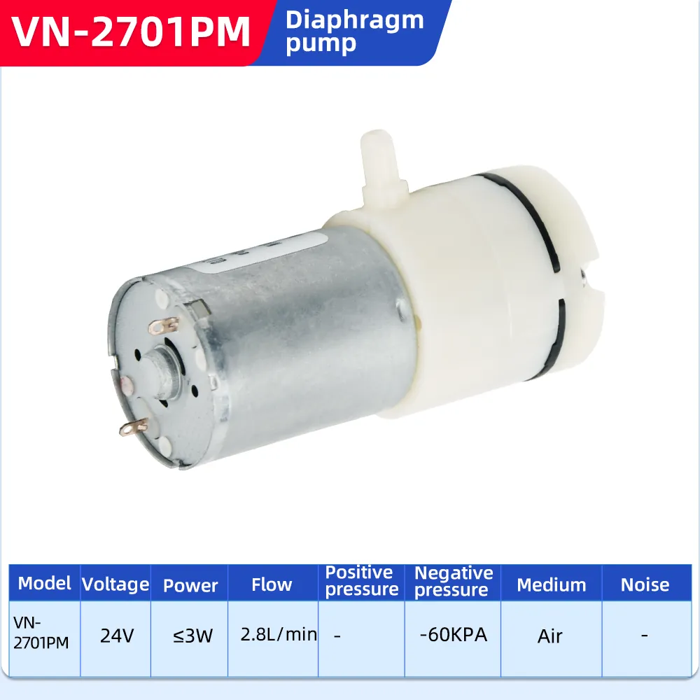 The VN-2701PM is a compact, low-power diaphragm pump designed for air transfer. Available in 6V, 12V, and 24V DC versions, it provides reliable airflow up to 5 L/min and a vacuum of -60 KPa for various industrial and DIY applications.