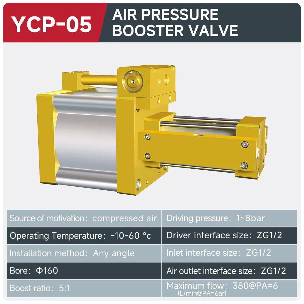 This booster regulator amplifies input pressure at a 5:1 ratio, delivering a maximum flow of 380 L/min (at 6 bar outlet) with a 1-8 bar driving pressure range, featuring ZG1/2 interfaces and flexible installation for generating high-pressure air in pneumatic systems and tools.