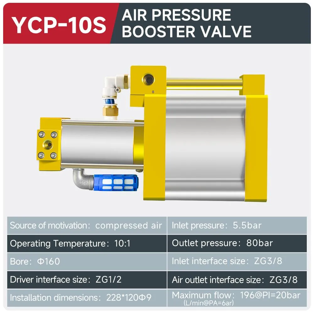 The YCP-10S air pressure booster valve uses compressed air as power, achieving a 10:1 boost ratio to raise 5.5bar inlet pressure to 80bar outlet pressure.